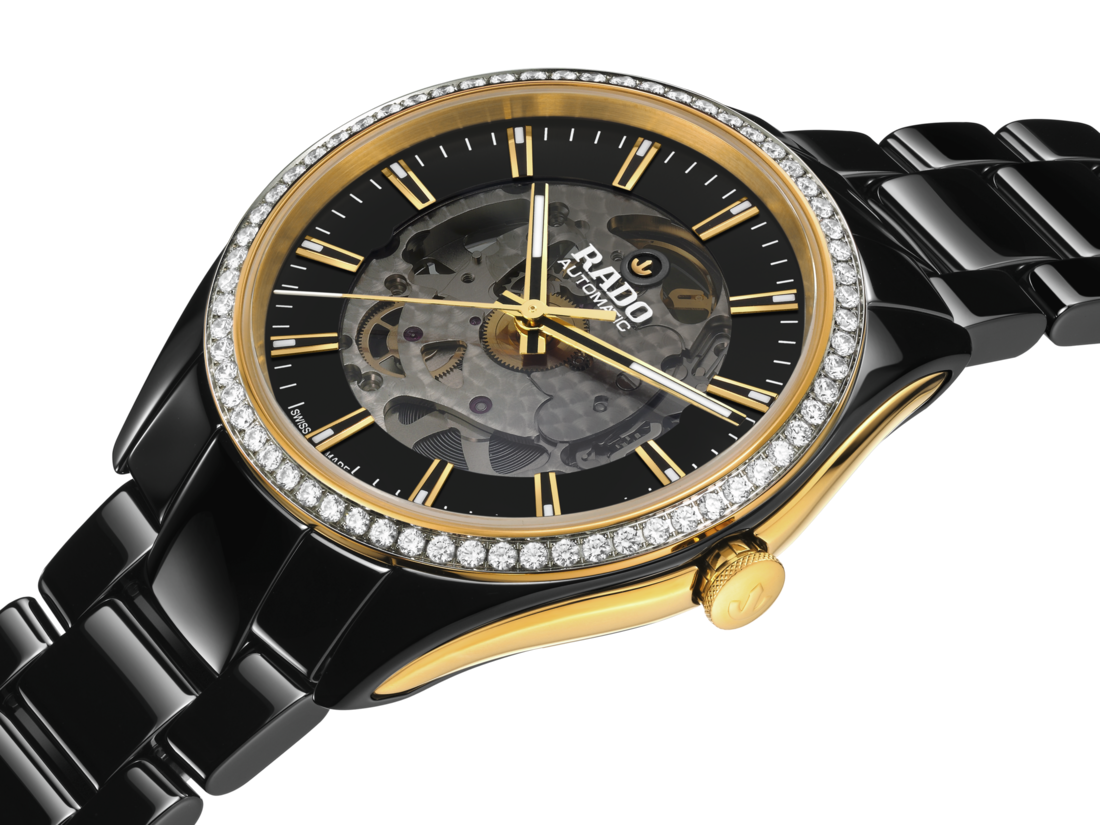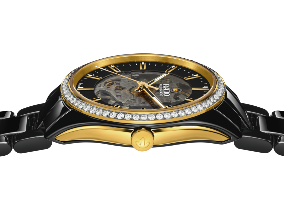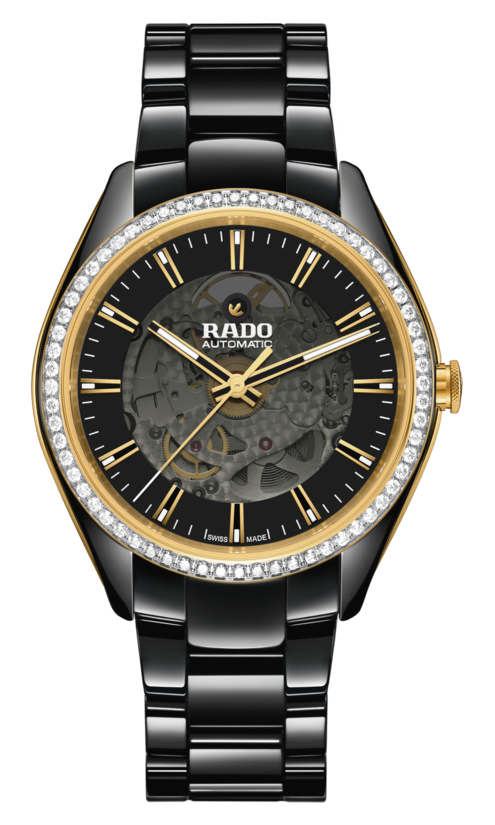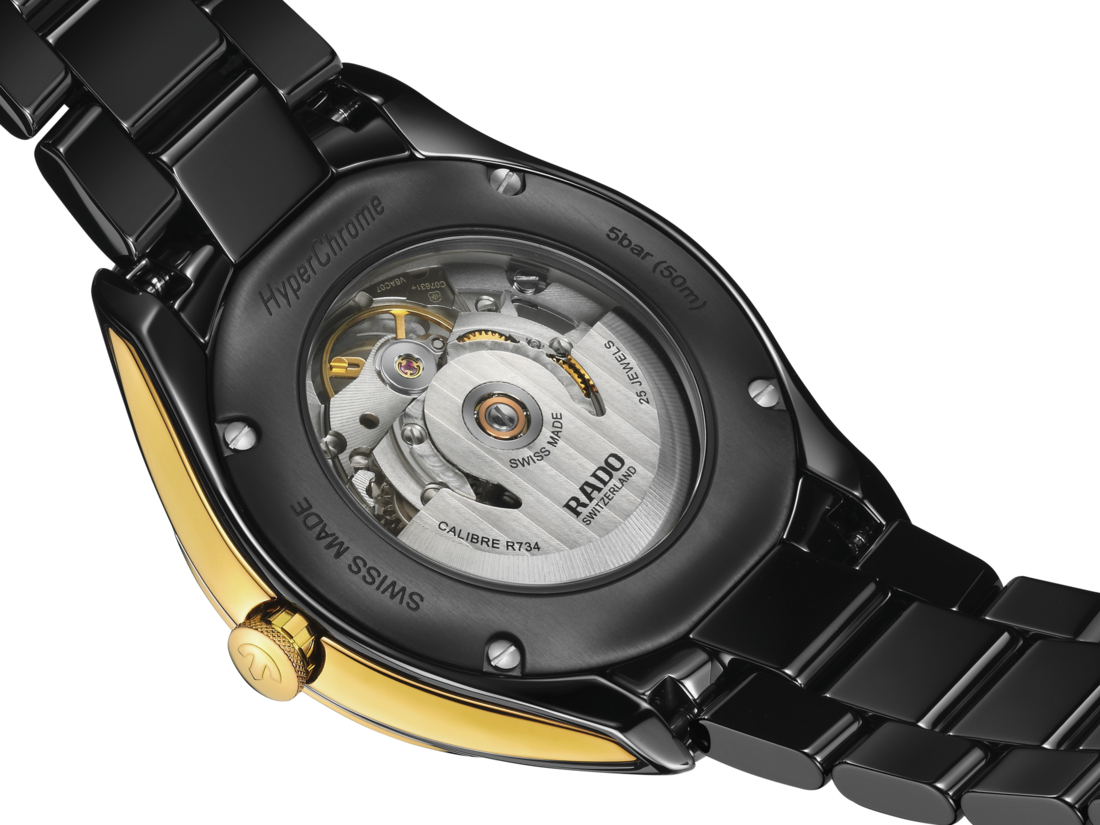 一体成型抛光黑色高科技陶瓷表壳,使HyperChrome皓星系列镶钻自动机械腕表成为一款集轻盈、耐磨、不易过敏的特性于一身的腕表。烟熏黑色蓝宝石玻璃表盘上的黄金色立体时标,搭配黑色饰面和覆有白色Super-LumiNova®夜光涂层,与黄金色指针完美搭配。透过烟熏黑色表盘,可以尽情欣赏R734型机芯出众的镂空设计。搭载Nivachron™防磁游丝以及可靠的生产技术,机芯从3方位至5方位进行标准测试,以实现更高的走时精准度。表盘直径42毫米,防水性能可达50米。腕表兼备运动和优雅风格,无论岁月变迁,能始终保持独特的色彩和光泽