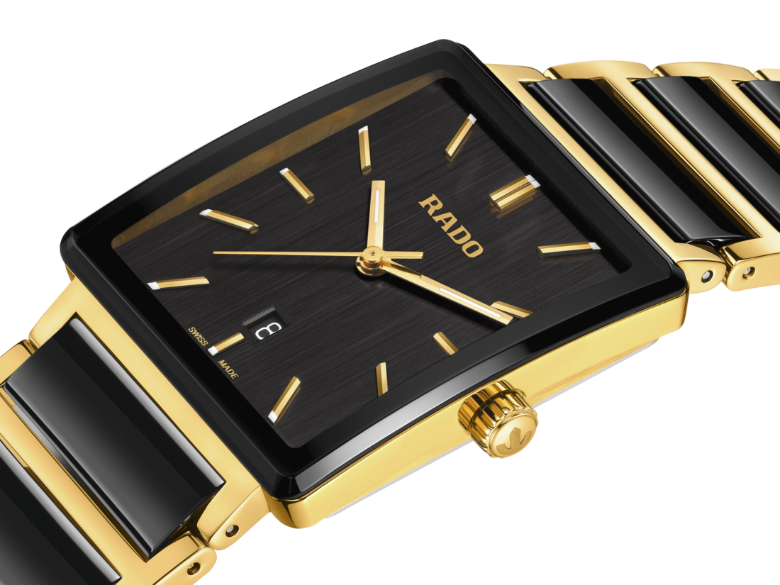 您的风格,自成格调:一场永不落幕的雅致叙事。悦享精臻舒适,典藏永恒典雅,尽在Rado瑞士雷达表Integral精密陶瓷系列。 标志性方形精钢表壳内,弧形蓝宝石玻璃表镜经防眩目处理,黑色金属镀层搭配开阔表盘。黄金色刻度点缀白色Super-LumiNova夜光涂层,与黑色垂直拉丝饰面及黄金色Rado标志相映成辉。黄金色时针与分针饰以白色Super-LumiNova夜光涂层,搭配黄金色秒针,确保随时清晰读时。奢华外观之下,搭载精准的Rado R218石英机芯。 Integral精密陶瓷系列采用微锥形表链——精钢材质覆以抛光黄金色PVD涂层,搭配抛光黑色高科技陶瓷中间链节——旨在与标志性方形表壳的典雅比例相得益彰。最终点睛之笔:弧形表镜与腕部曲线巧妙契合,这无疑印证了您的非凡品味。 纤薄流畅,典雅不凡,Rado瑞士雷达表Integral精密陶瓷系列是可以相伴一生的选择。