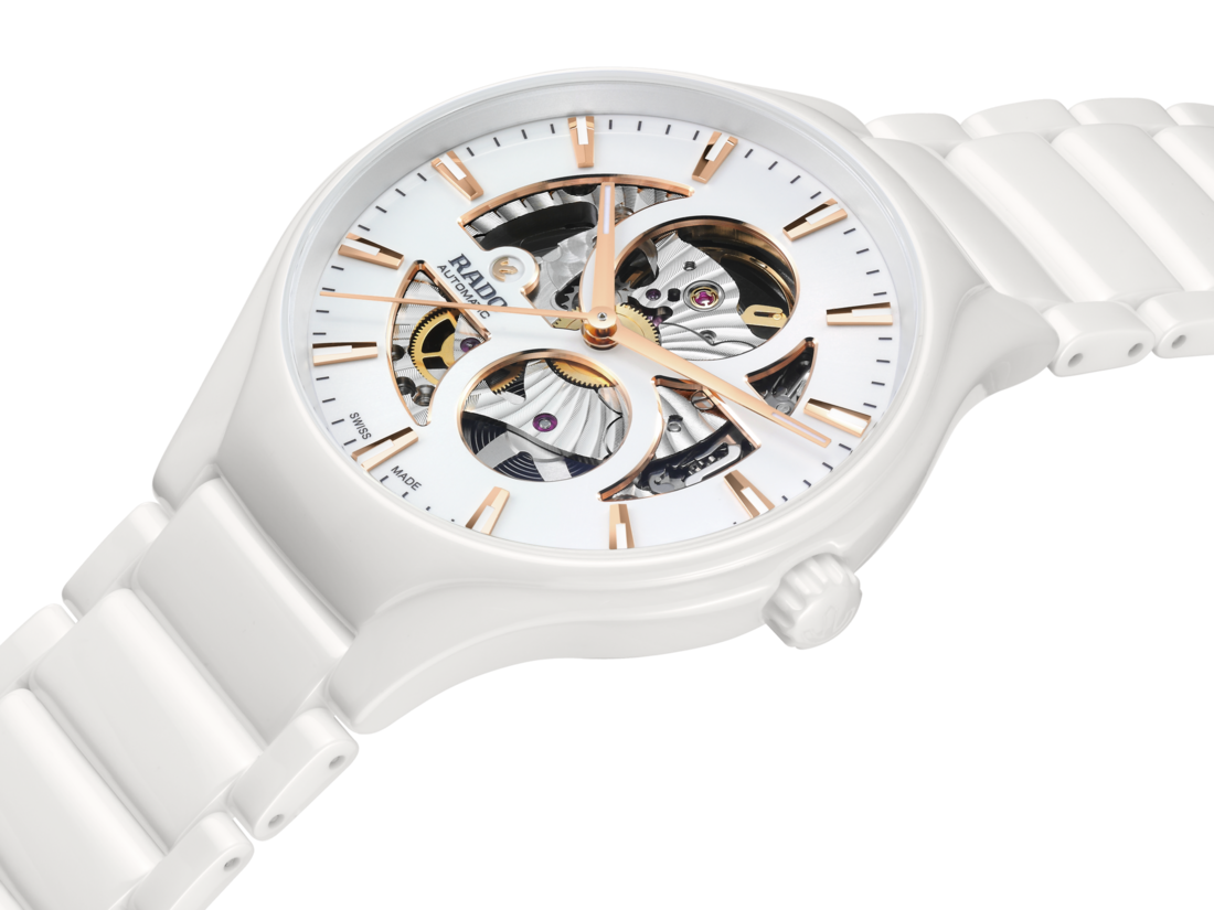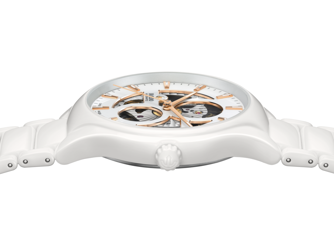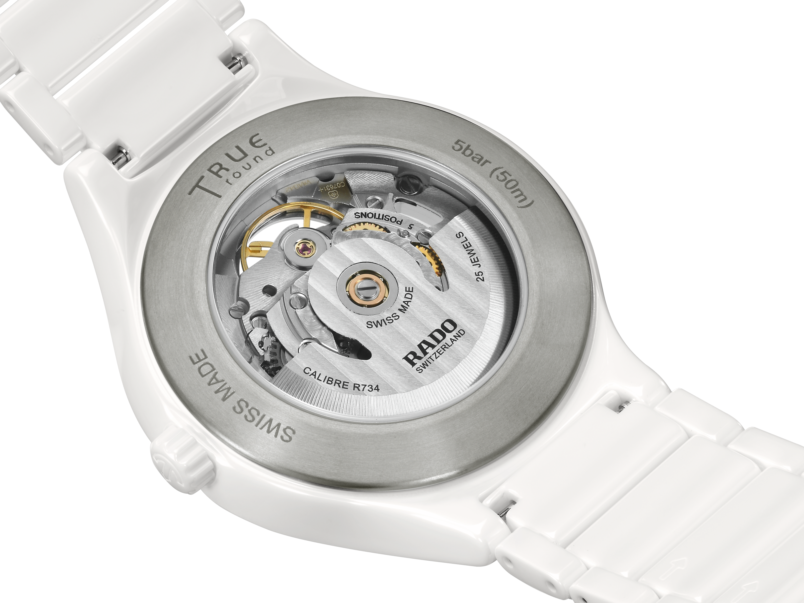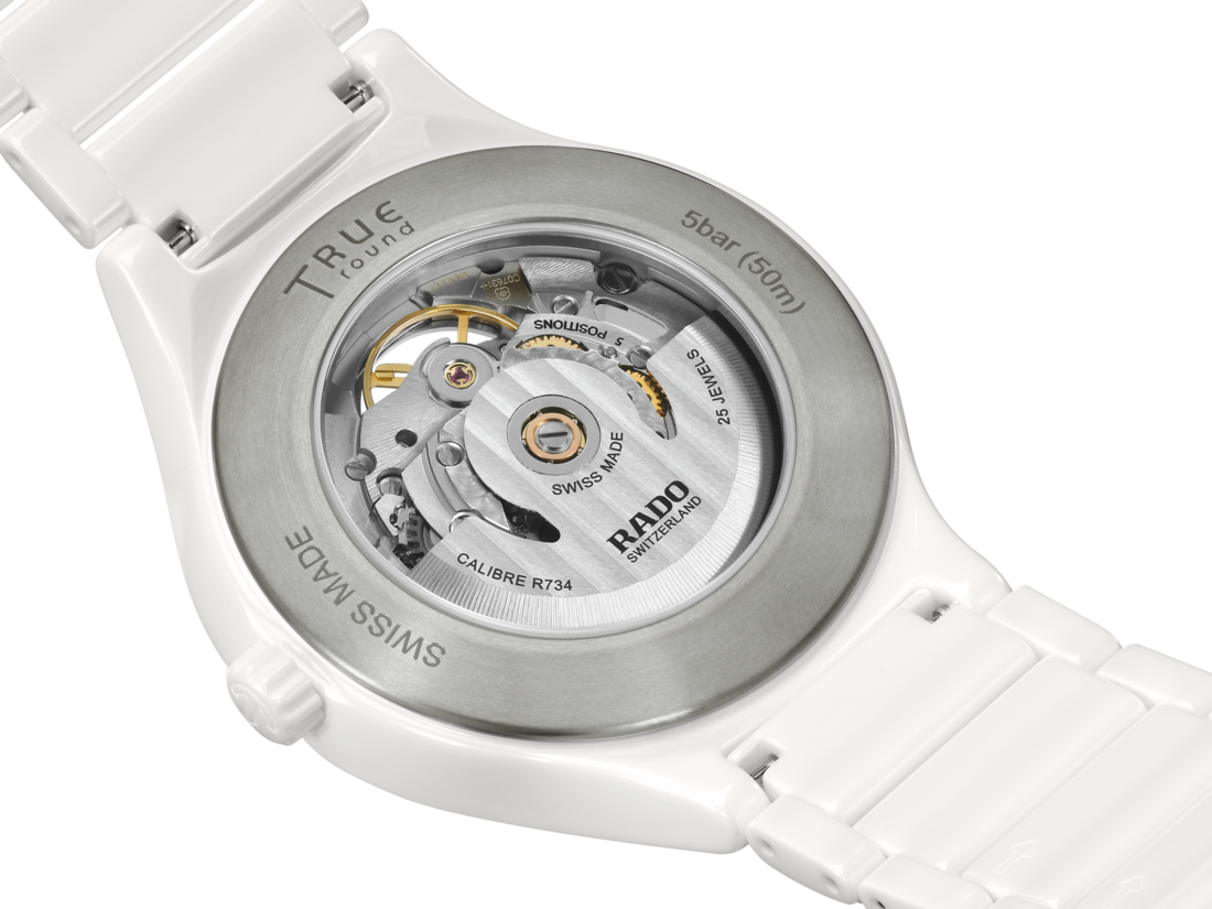 探索Rado瑞士雷达表True Round真系列开芯腕表的卓越设计与出色材质,这款出众的腕表采用迷人的开芯设计,令佩戴者可以尽情欣赏Rado瑞士雷达表R734型自动机芯的律动之美,展现了品牌精湛的制表技艺。腕表搭载Nivachron™防磁游丝,拥有最高长达80小时的动力储存。腕表拥有抛光白色高科技陶瓷一体成型表壳和表冠,钛金属底盖搭配透明蓝宝石玻璃,可让人轻松欣赏机芯的风采魅力。腕表采用白色太阳纹表盘,搭配玫瑰金色斜面以及灰色印纹分钟圈。这款腕表搭配抛光白色高科技陶瓷表链与钛金属三折式表扣,能够恰如其分地展现自己的魅力,腕表的防水性能可达50米。Rado瑞士雷达表True Round真系列开芯腕表,专为像您这样钟情于现代风格腕表的男士和女士而设计,它们拥有经久不衰的魅力和独特的风格,是当之无愧的纪念臻品。