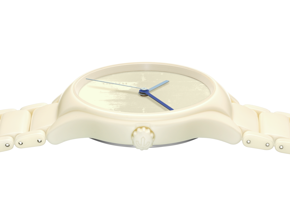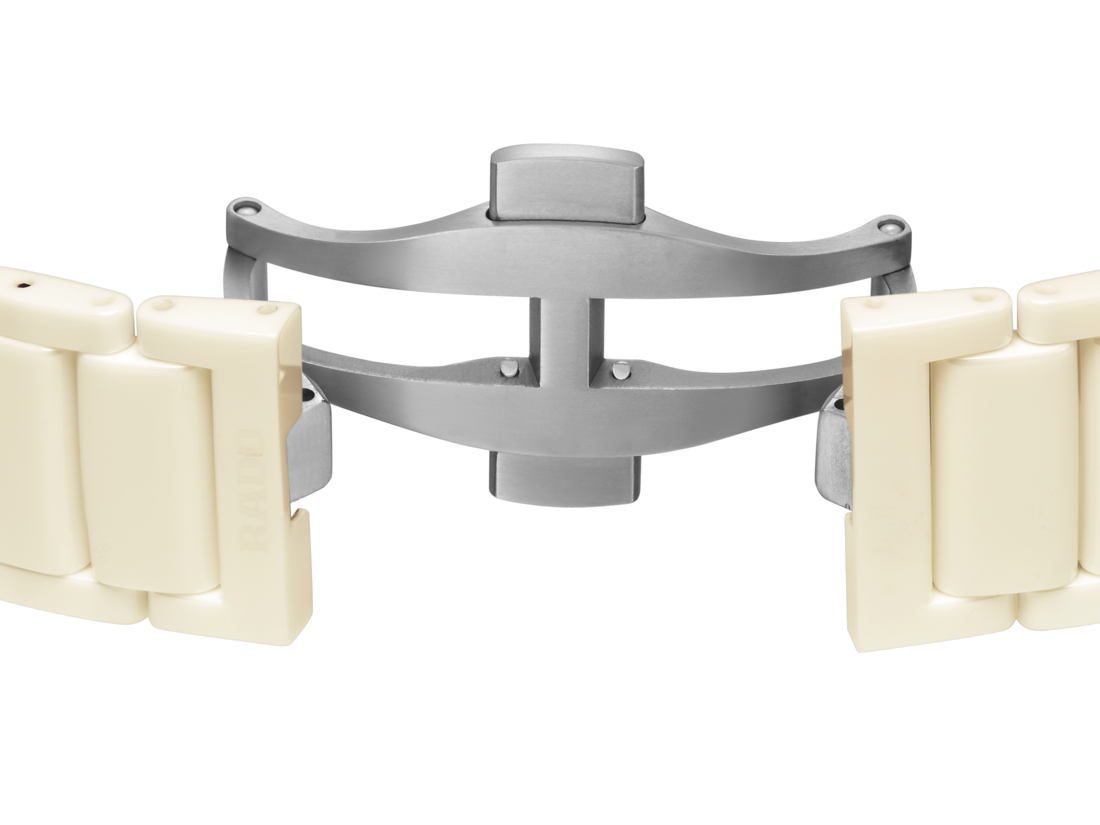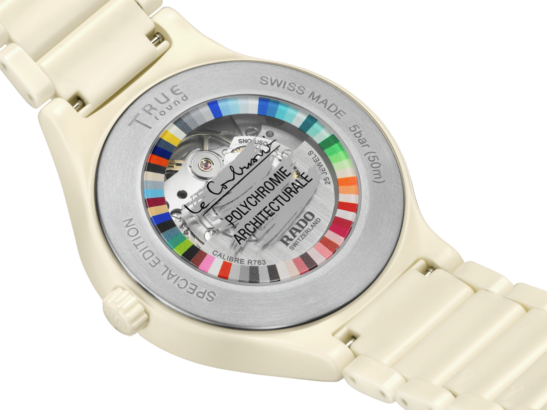 哑光 BLANC IVOIRE (4320B) 色调的高科技陶瓷表链及一体成型表壳,其配色源自勒·柯布西耶《建筑色彩学》,这一设计再度印证了 Rado 瑞士雷达表作为“材质大师”(Master of Materials) 的卓越地位。同时高科技材质的使用也能保证佩戴舒适度。 弧形蓝宝石玻璃表镜结合高科技陶瓷,让您的腕表历久弥新。表镜两面均覆以防眩目涂层,确保表盘细节清晰可见。表盘通过激光雕刻工艺,以抽象视觉效果再现混凝土表面纹理,其灵感源自法国马赛市的建筑作品“光辉之城” (La Cité Radieuse)。Rado 标识设于 8 点钟位置。指针采用《建筑色彩学》中的其他色彩—— OUTREMER MOYEN (32021)、BLEU OUTREMER 31 (32020) 和 OUTREMER PÂLE (32023),与腕表整体和谐互补。 腕表搭载 Rado R763 型自动上弦机芯,拥有最高长达 80 小时的动力储备,并配备 Nivachron™ 防磁游丝。机芯经过五方位测试和调校,超越标准要求,保证可靠性和精准性。