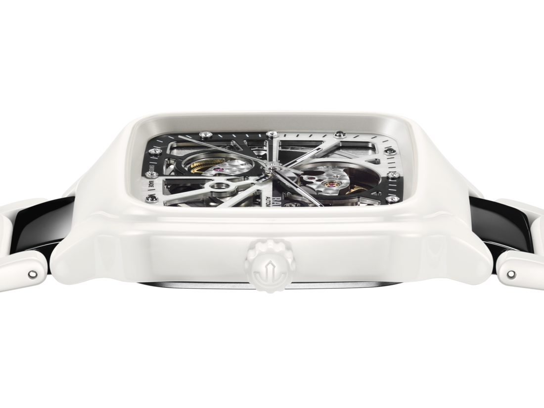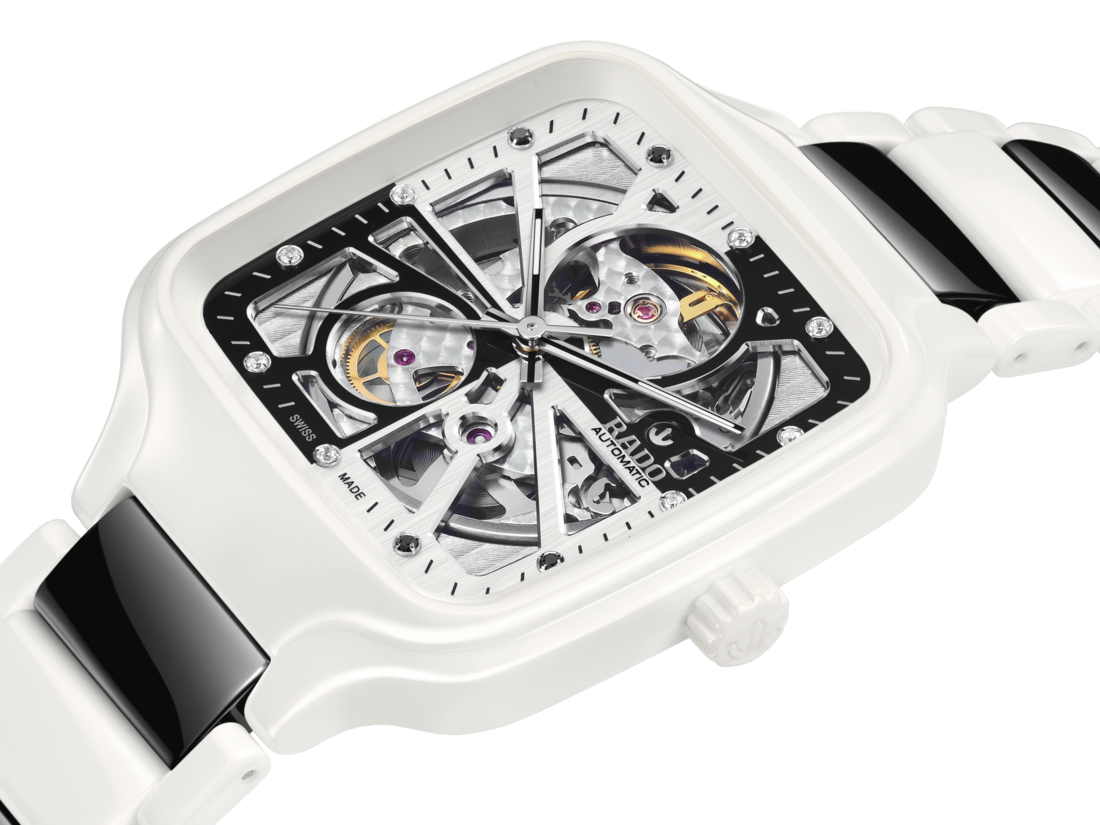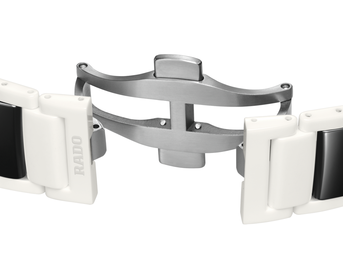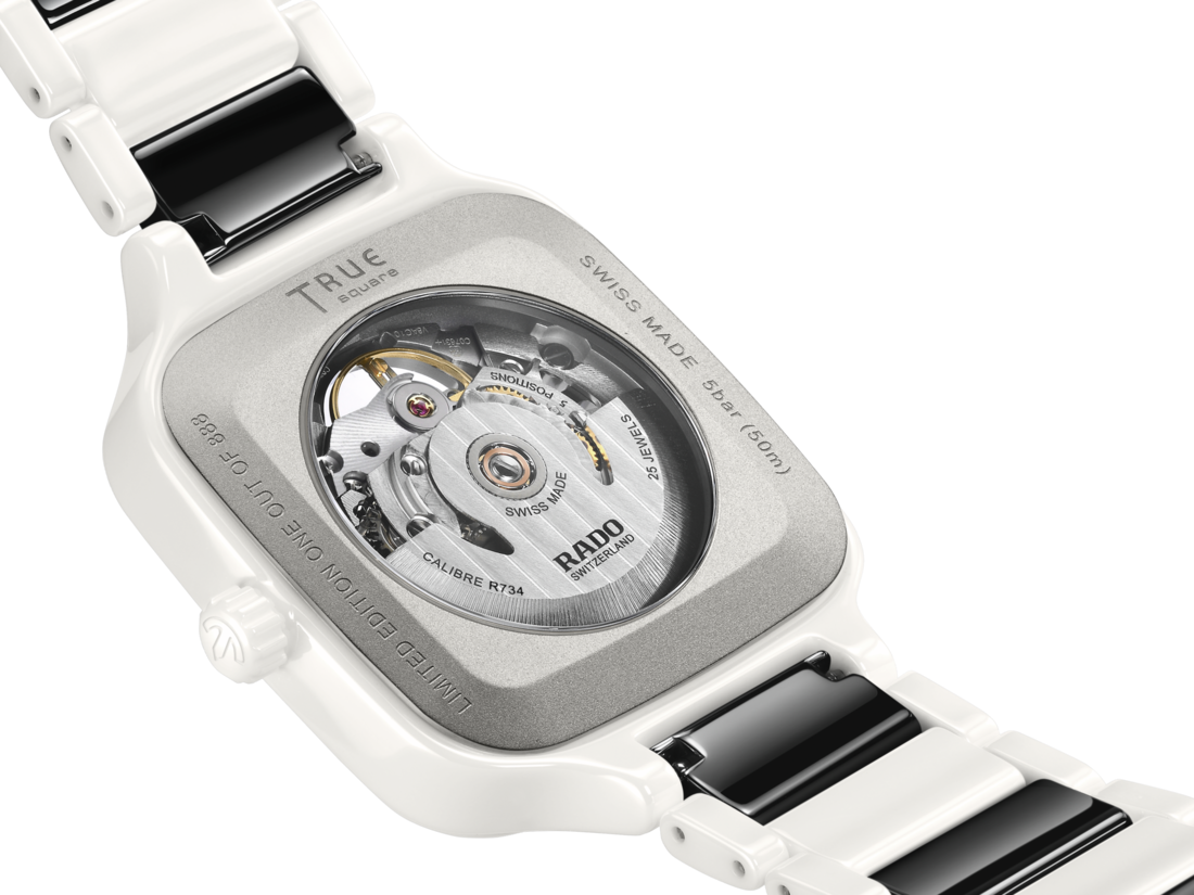 这款腕表采用白色高科技陶瓷一体成型表壳和表冠,表链同样以抛光高科技陶瓷制成,呈现黑白配色。喷砂钛金属底盖搭配蓝宝石玻璃,特殊镌刻“LIMITED EDITION ONE OUT OF 888”字样。与黑色同款腕表一样,这款腕表采用黑白垂直拉丝表盘,映衬璀璨的8颗全切割白钻和4颗黑钻时标。这款腕表还采用了其他设计元素,包括铑色表圈、黑色表盘圈,以及独特的铑色可摆动锚形标志,搭配对比鲜明的黑色背景,呈现出令人赞叹的视觉效果。银色“Rado”和黑色“Automatic”徽标更加彰显奢华质感。