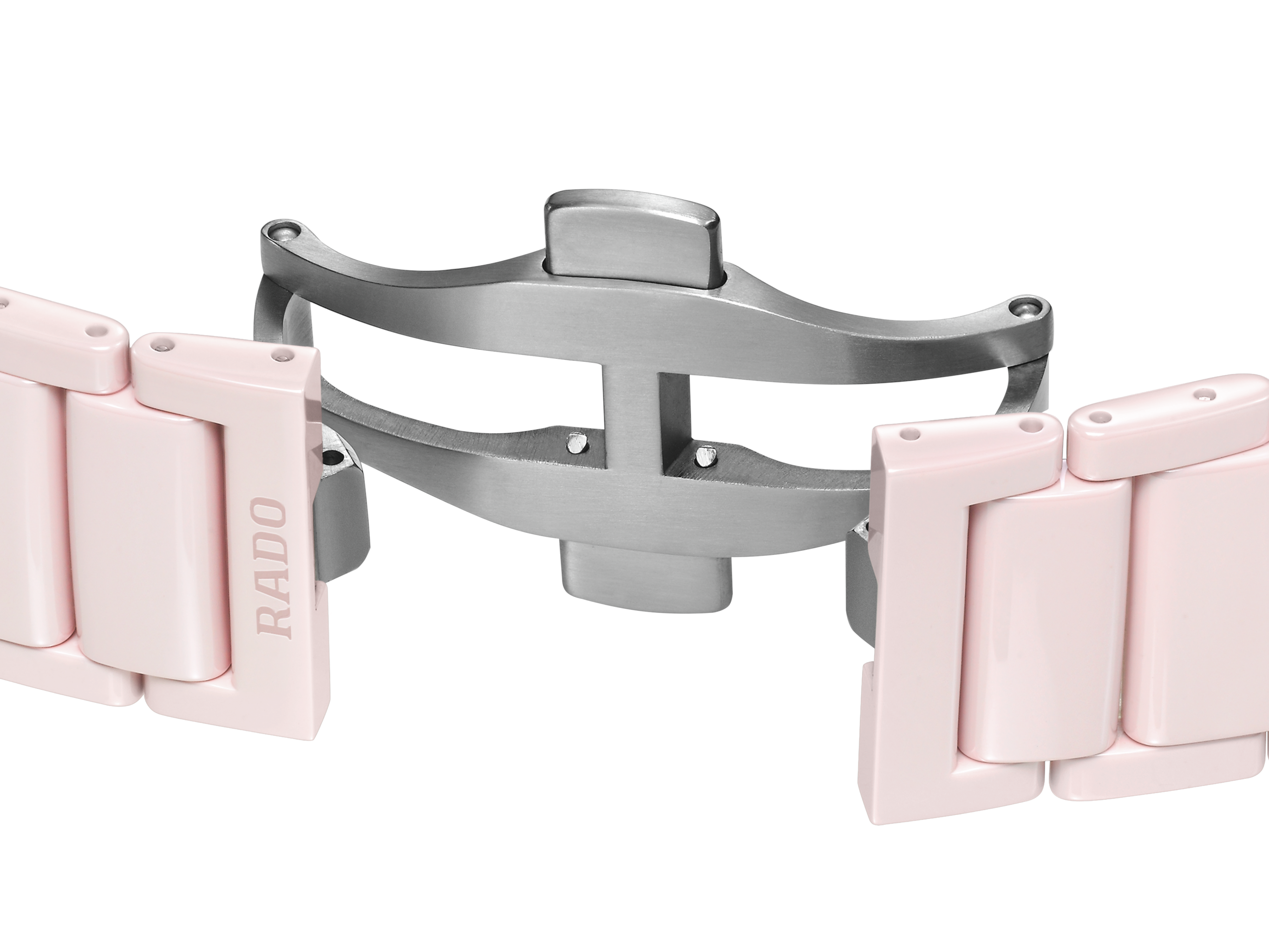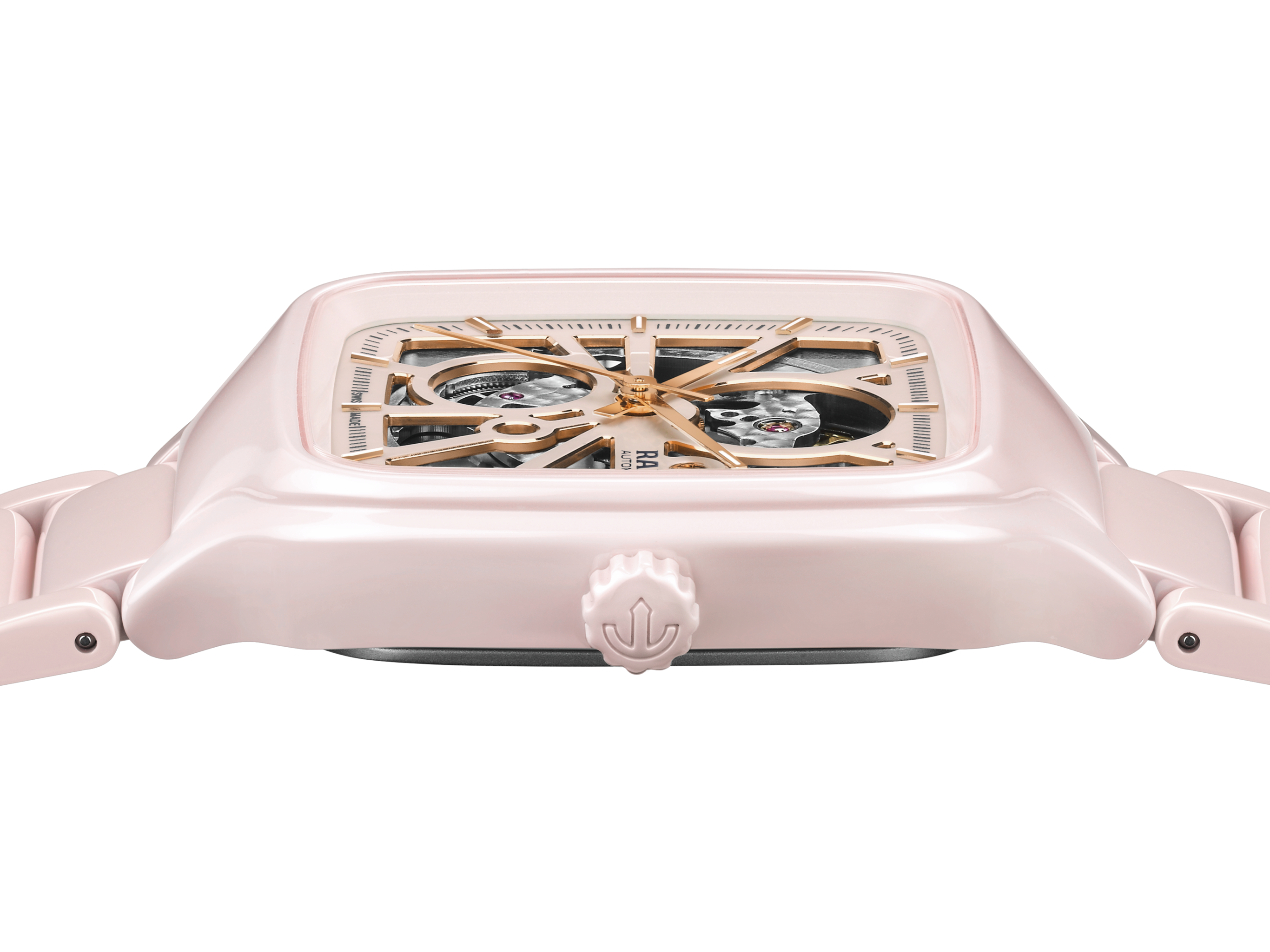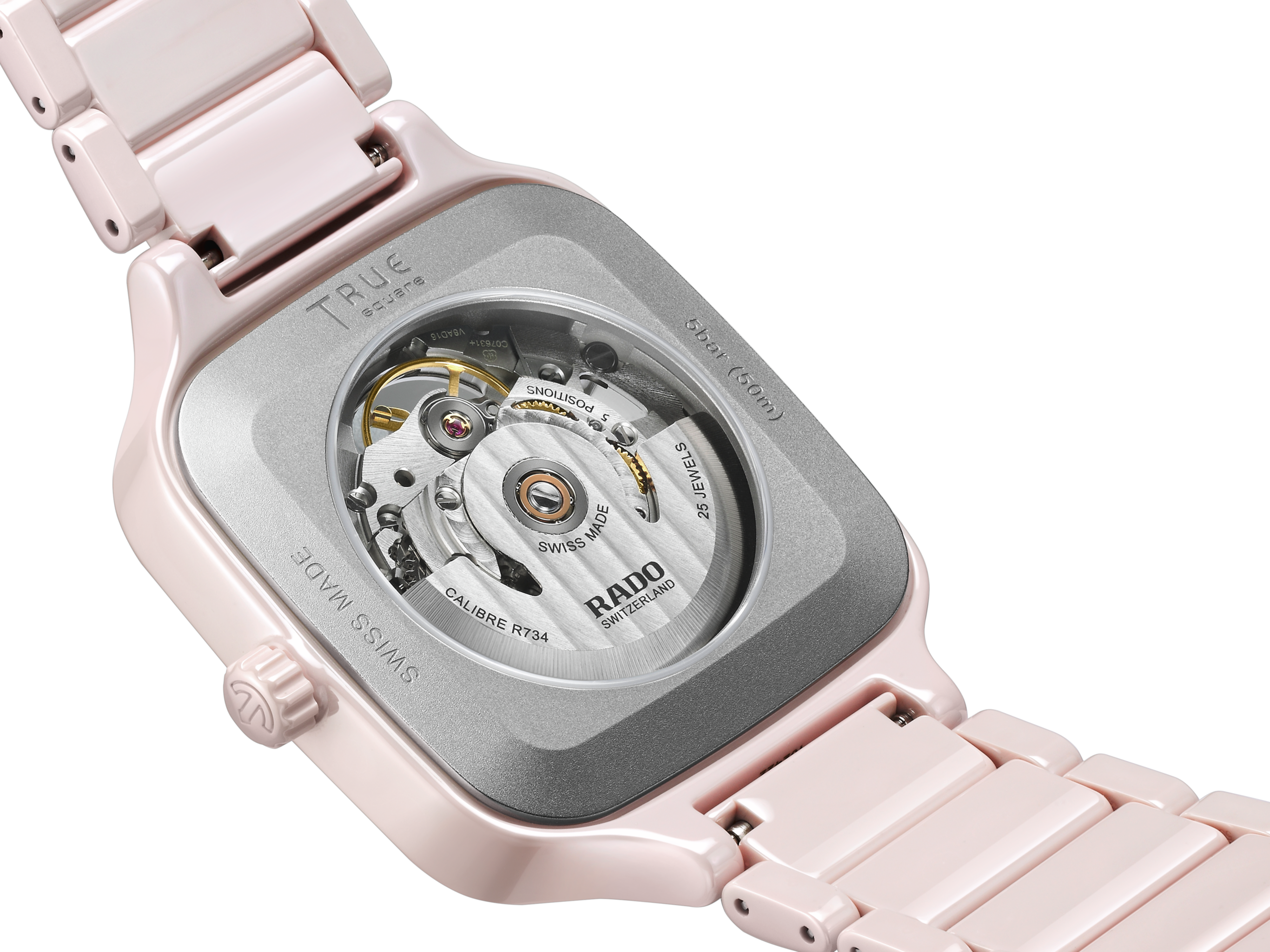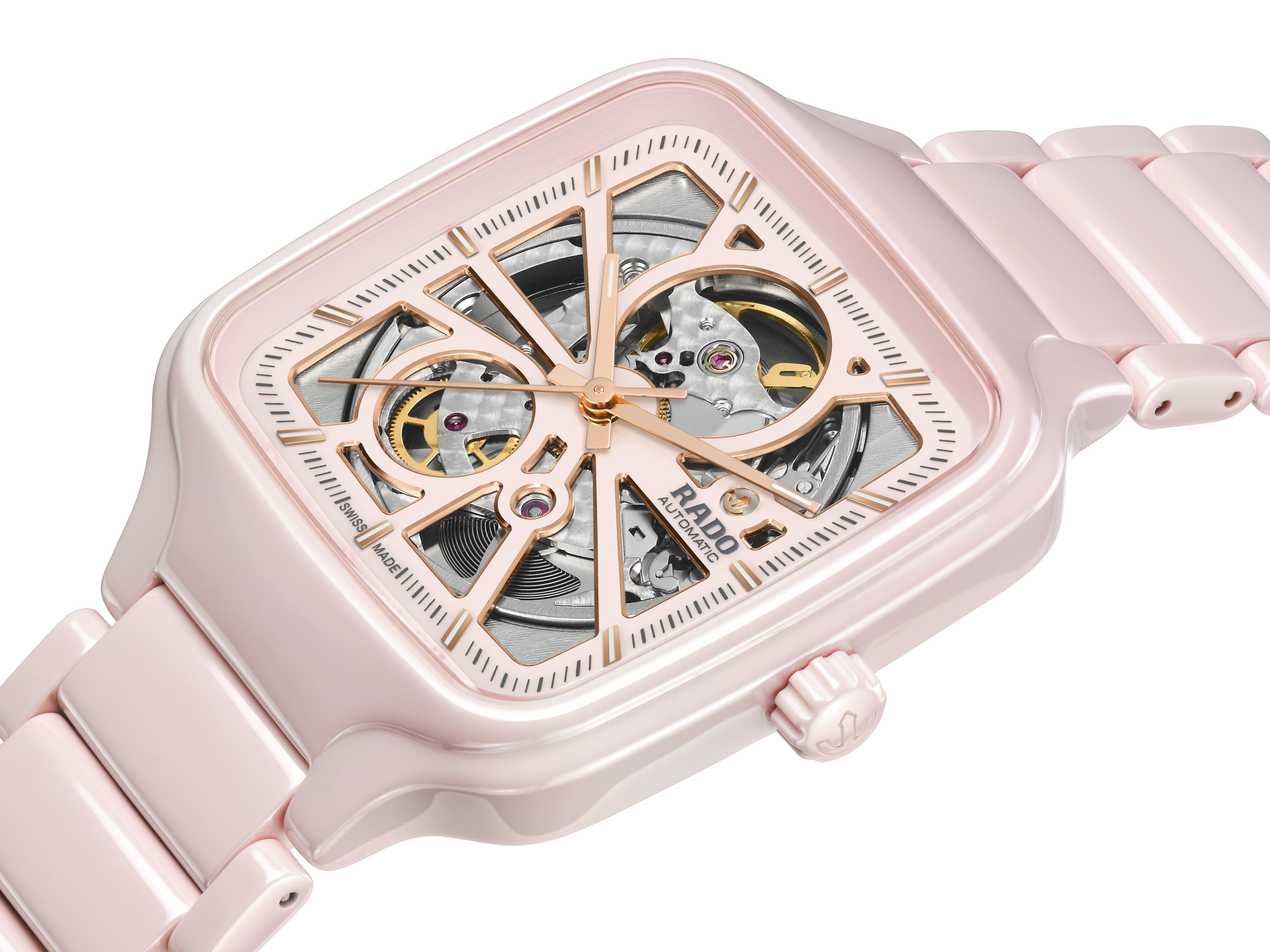 Rado瑞士雷达表True Square真我系列开芯腕表完美融合尖端高科技材质与精湛工艺。 38毫米抛光玫瑰金色高科技陶瓷一体成型表壳,以1,250维氏硬度成就轻盈体态、抗敏特性与非凡耐久。此坚韧表壳护卫着R734型机芯——配备25颗宝石轴承、80小时动力储存及Nivachron™防磁游丝。 平面蓝宝石水晶表镜下,镂空设计将机械律动以剔透姿态优雅呈现。玫瑰金色太阳纹表盘精工雕琢,斜面窗口镶嵌同色玫瑰金框,彰显内蕴机械之美。玫瑰金色立体时标填充白色Super-LumiNova®夜光涂层,佐以精细印刷灰色分钟刻度,共构和谐精准的视觉诗篇。透视镂空区域可见机芯夹板饰以日内瓦条纹,表盘侧机芯更镌优雅环形纹。三点钟方位稍高处,玫瑰金色经典可摆动锚型标志为这幕制表艺境注入灵动神采。 抛光玫瑰金色高科技陶瓷表链与表壳相得益彰,搭配钛金属三折式表扣,呈现高科技陶瓷无可比拟的佩戴舒适性。
