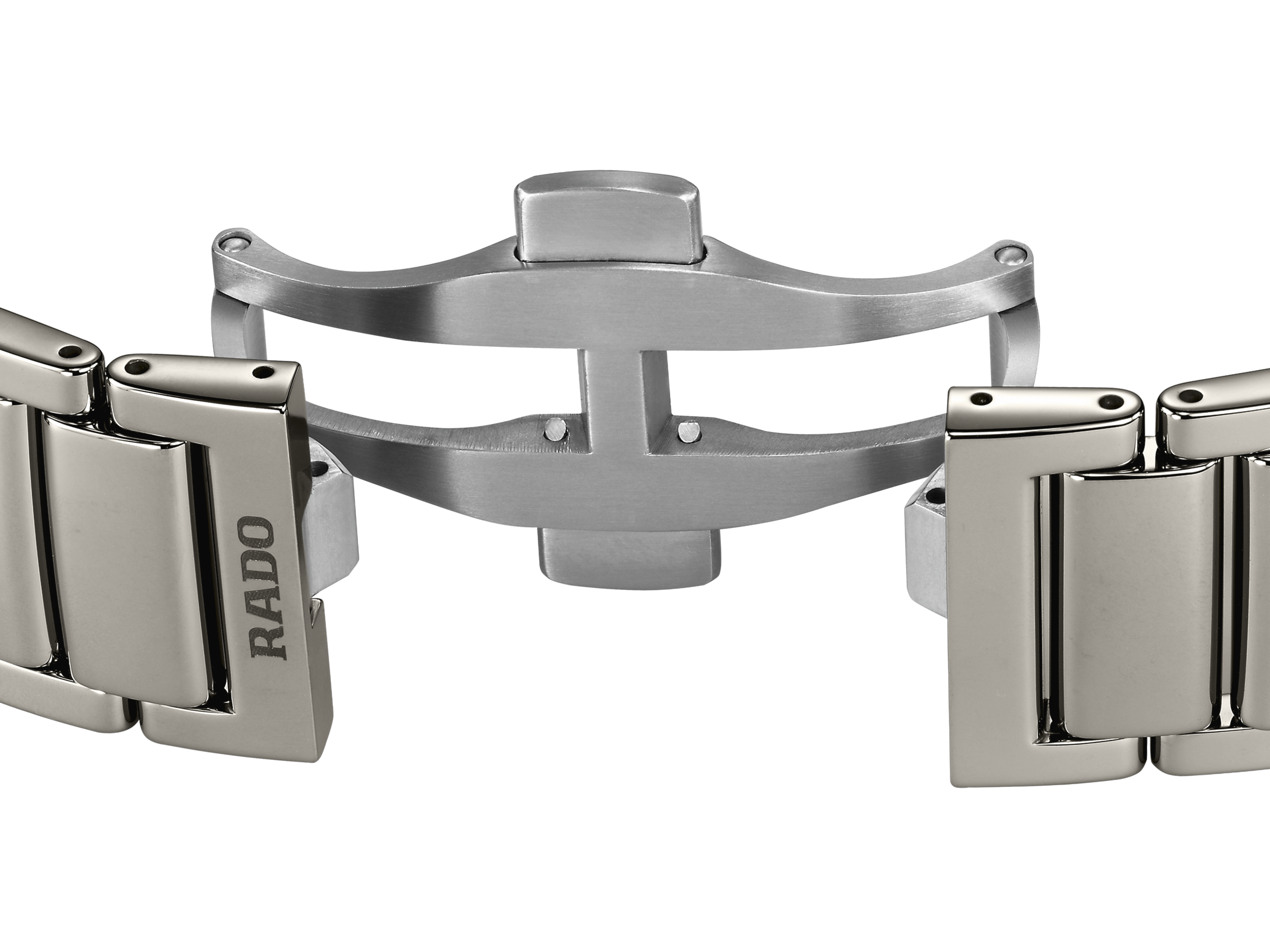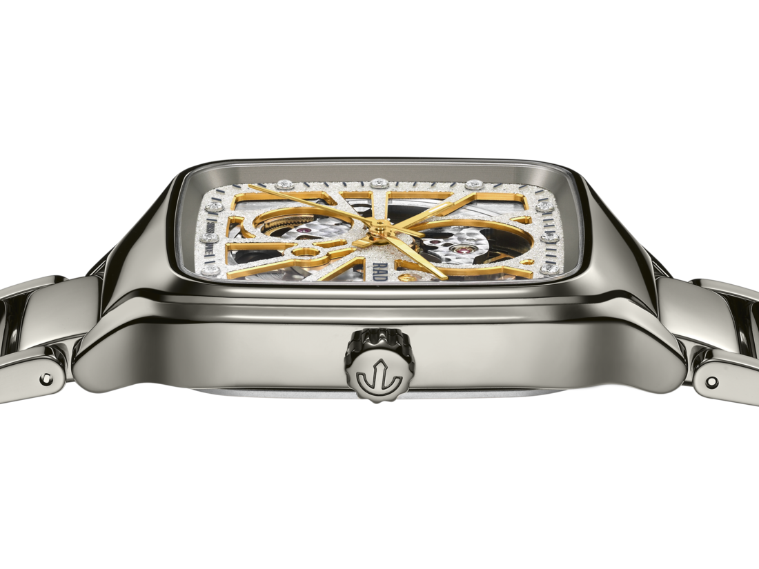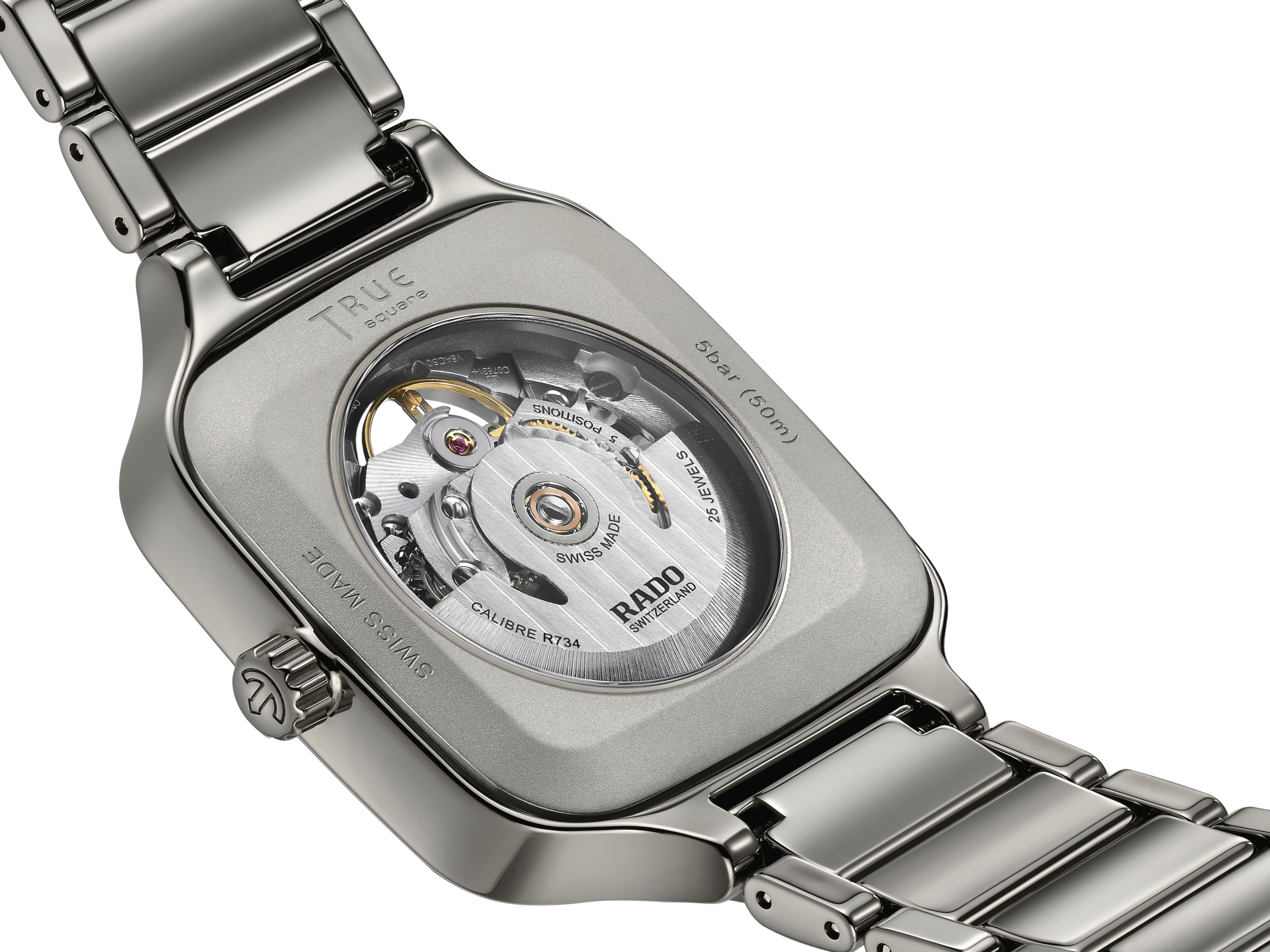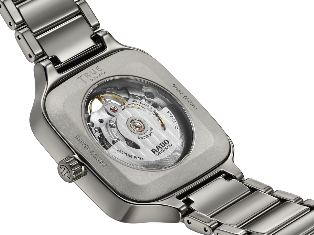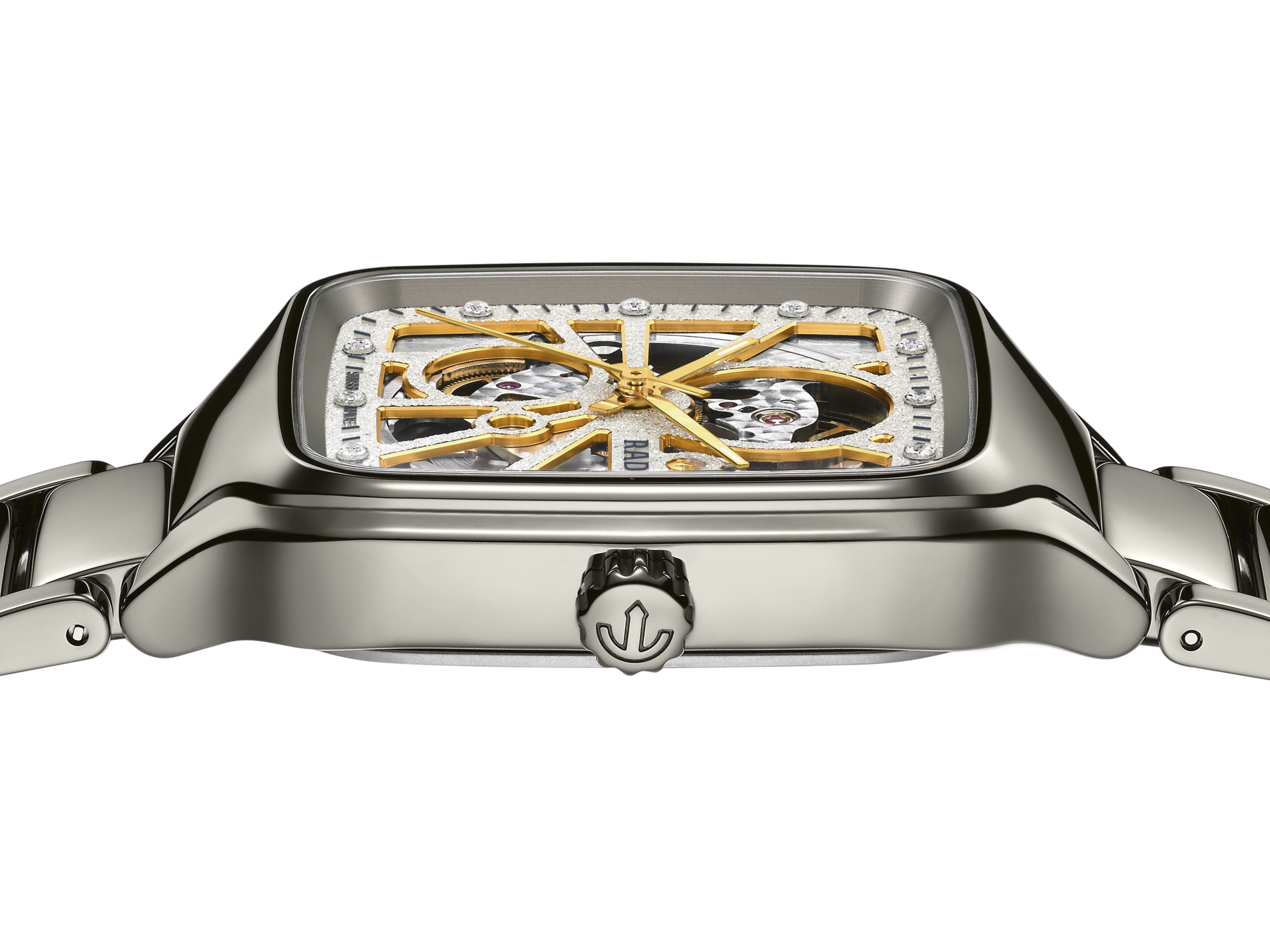 这款Rado瑞士雷达表True Square真我系列开芯腕表,以钻石、璀璨表盘与一体成型抛光等离子高科技陶瓷方形表壳点亮光华。蓝宝石玻璃表镜为表盘增添熠熠辉彩,12枚钻石刻度与铑色钻石粉末质感涂层璀璨交织。浅浮雕灰色分钟轨道环抱黄金色时针与分针,覆有Super-LumiNova夜光涂层,搭配黄金色秒针。镂空视窗将目光引入腕表核心之境,Rado瑞士雷达表R734型自动机芯凭借NivachronTM防磁游丝与最高长达80小时的非凡动力储存,提供精准可靠的走时性能。表盘采用独特电铸工艺开发,呈现钻石粉末般质感,并使Rado瑞士雷达表标志、刻度与分钟轨道以浮雕形态凸起于表盘基底,尽显电镀工艺之美。抛光等离子高科技陶瓷、璀璨表盘与12颗jubilé钻石相融,缔造令人无法抗拒的奢华与典雅。