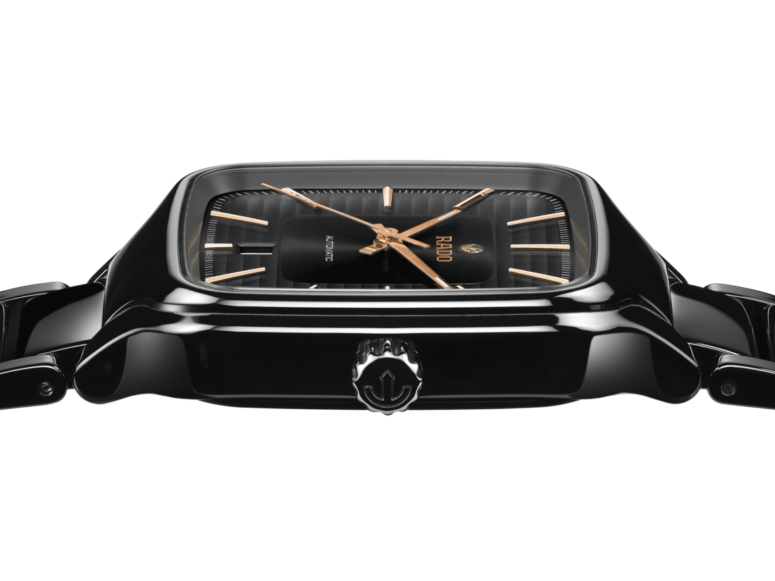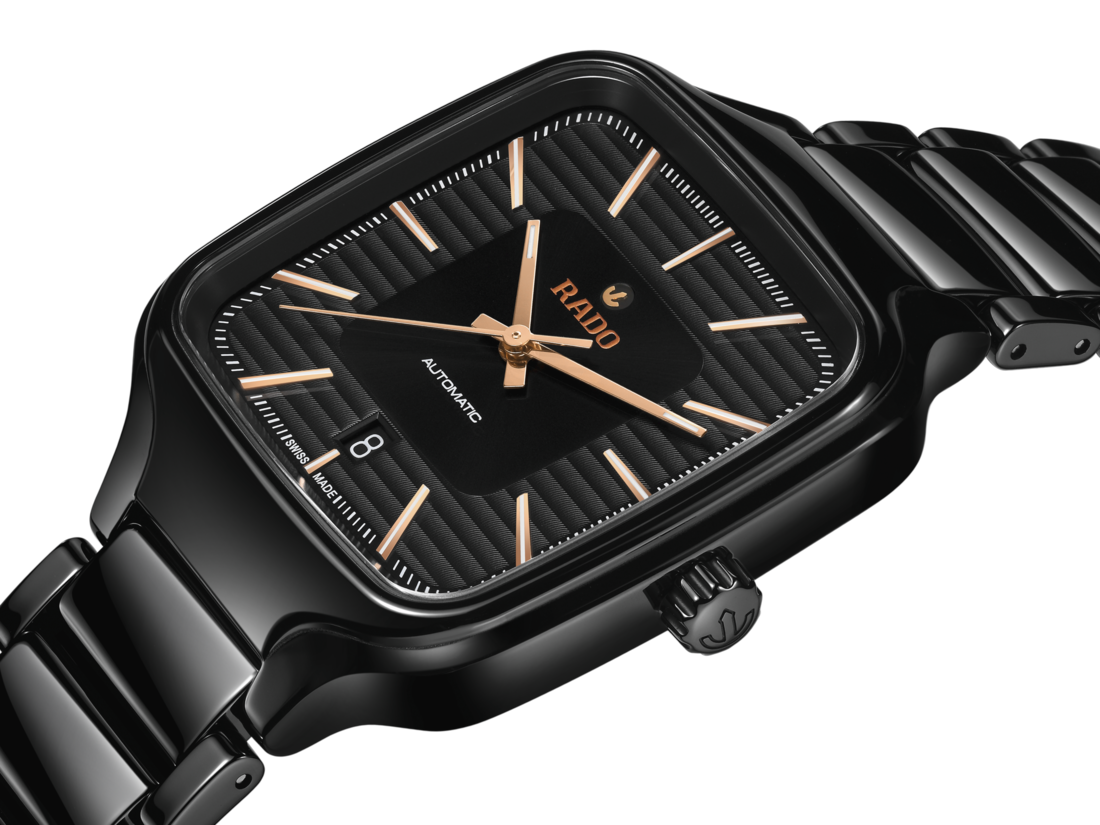 True Square真我系列腕表直径38毫米,搭载抛光黑色高科技陶瓷表壳和表冠,以及平面蓝宝石玻璃表镜。得益于Rado R763自动机械机芯,让腕表的走时精准可靠。玫瑰金色指针和覆有白色Super-LumiNova®夜光涂层的时标,完美搭配带有黑色压印水平设计细节的表盘。腕表动力储存长达80小时,防水性能达5巴。黑色抛光高科技陶瓷表链,搭配三折式钛金属表扣,确保True Square真我系列腕表佩戴舒适。