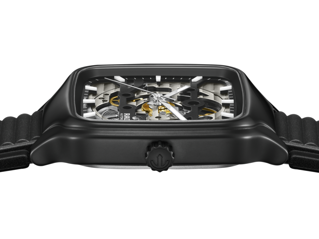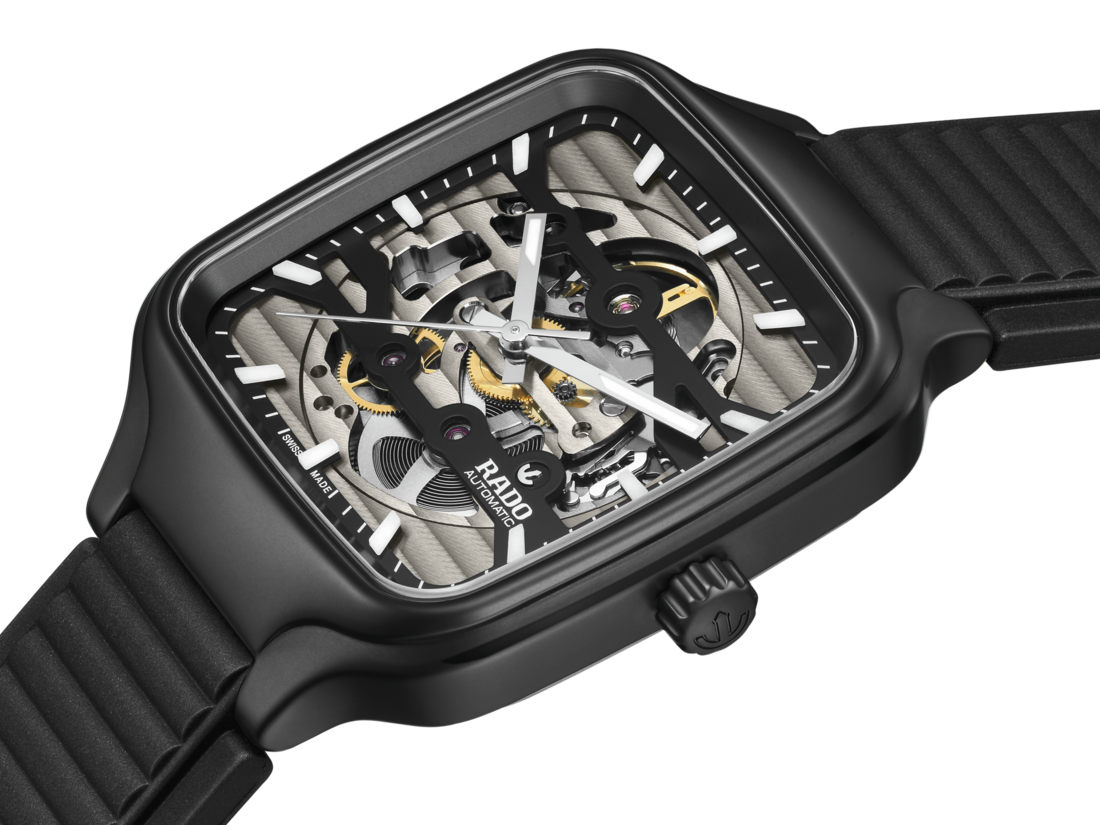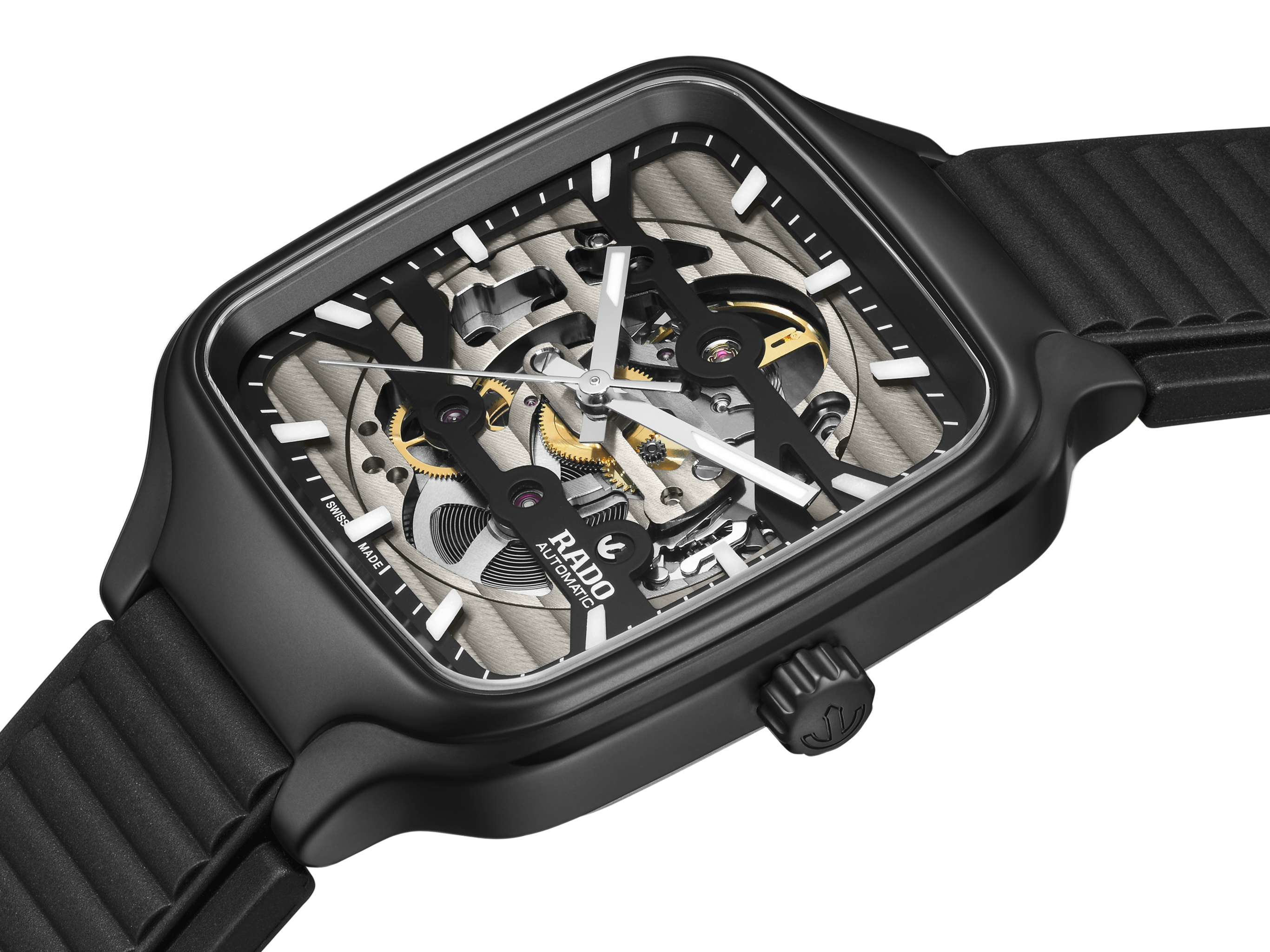 Rado瑞士雷达表True Square真我系列镂空腕表将尖端高科技材质与精湛工艺巧妙结合。 38毫米哑光黑色高科技陶瓷一体成型表壳内,搭载R808镂空机芯,点缀25颗宝石,并提供最高长达80小时的动力储存。机芯通过五个方位测试,配备Nivachron™防磁游丝,表盘侧面采用水平拉丝装饰,充分展现瑞士制表精准技术的匠心技艺。 平面蓝宝石玻璃表镜覆盖于表盘之上,多重层次的工艺可谓巧夺天工。黑色喷砂镂空顶板悬浮于底板之上。顶板上,白色Super-LumiNova刻度与精致印制的白色分钟刻度排列有序,与深色背景形成鲜明对比,可清晰读时。底板采用细腻的水平日内瓦条纹装饰,与机芯设计浑然天成。4点钟位置的标志性旋转铑色可摆动锚型标志,为精美的表盘画龙点睛。 黑色橡胶表带与表壳相得益彰,采用精钢可伸缩折叠表扣,搭配哑光高科技陶瓷扣面