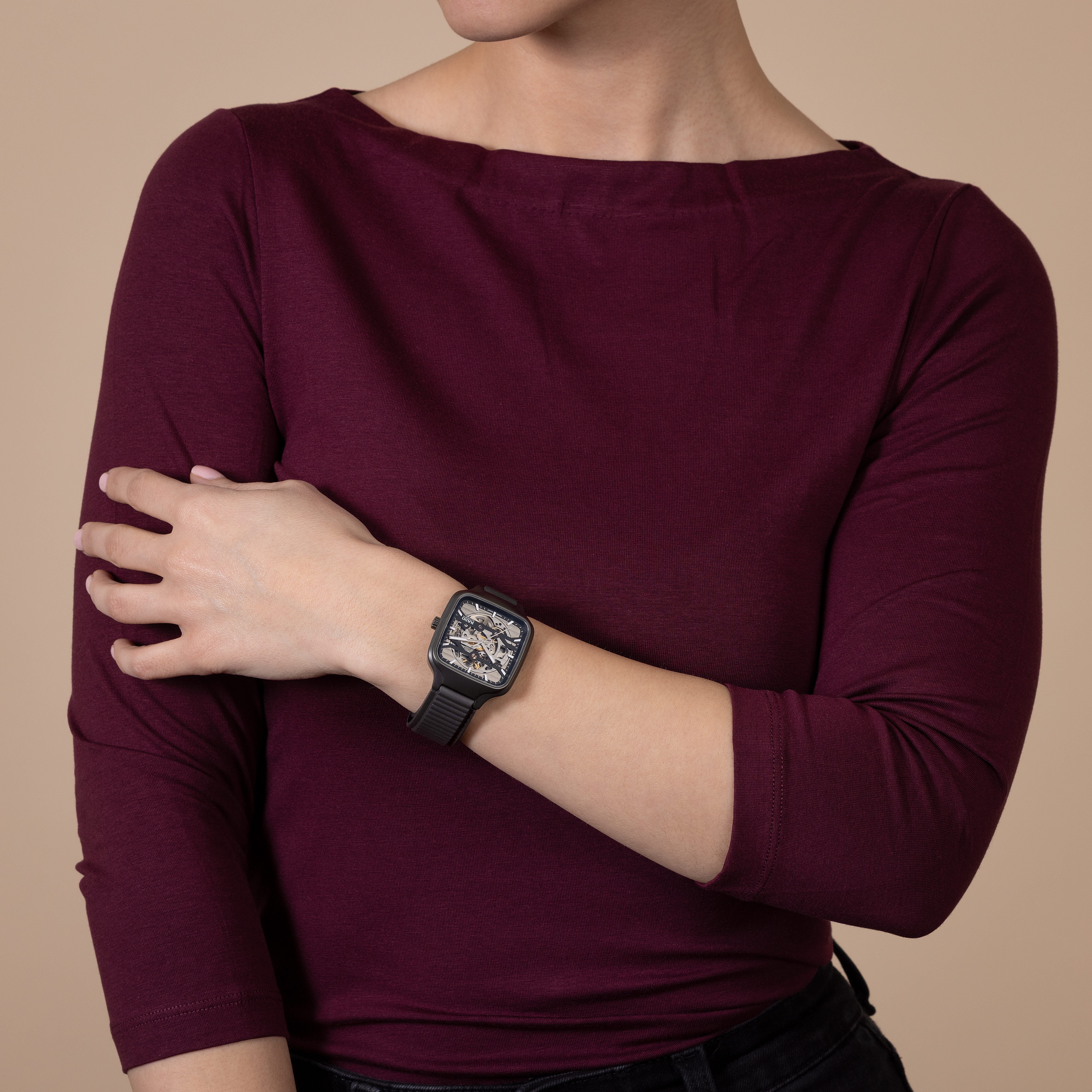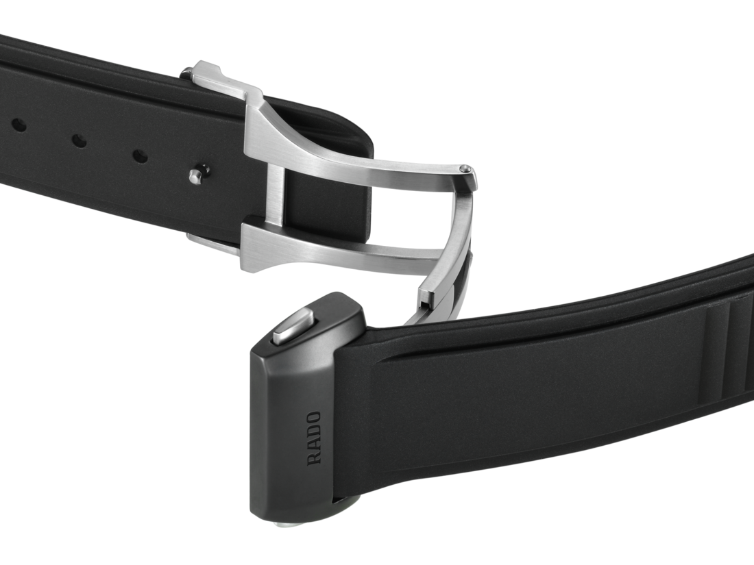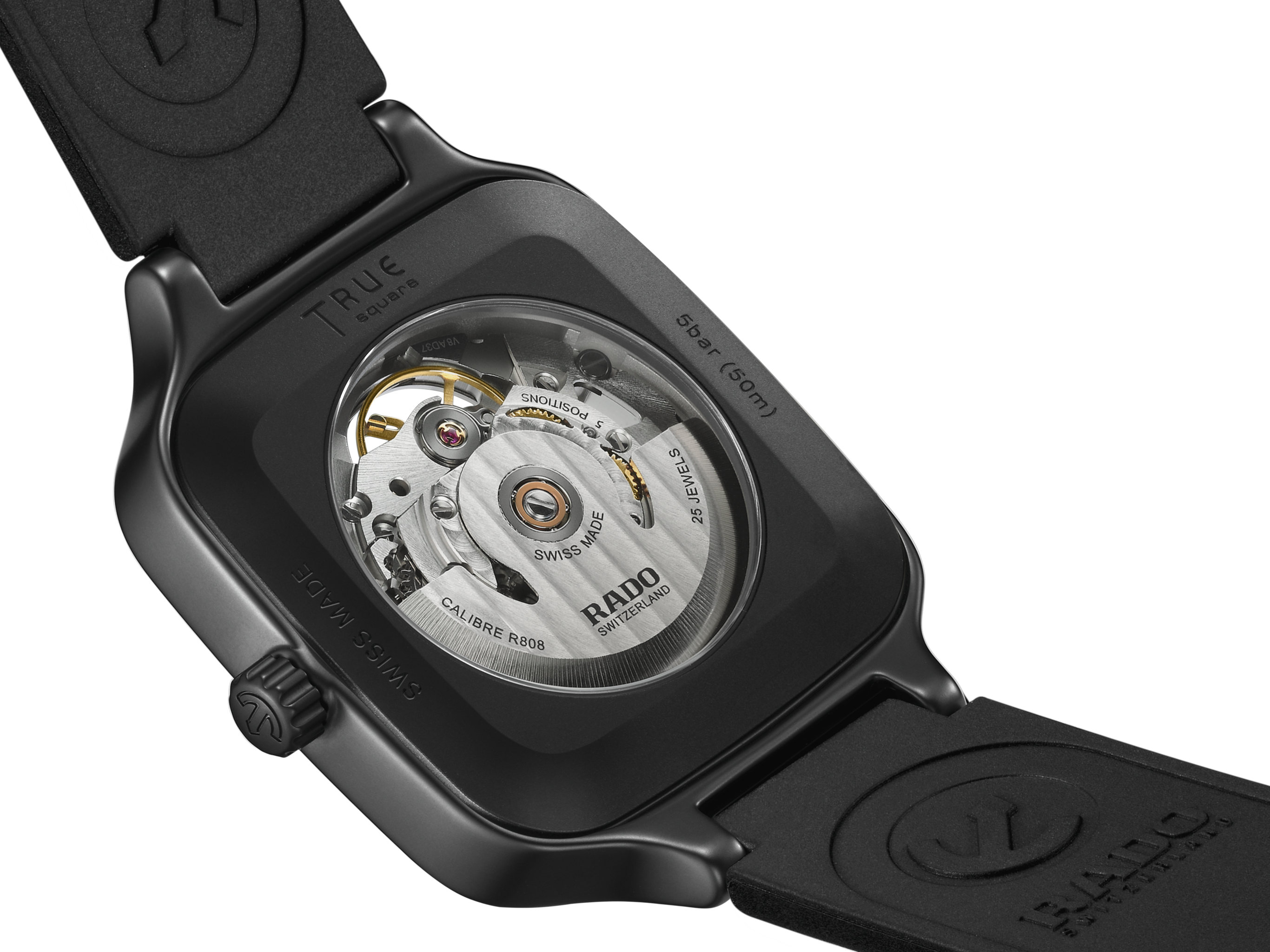 Rado瑞士雷达表True Square真我系列镂空腕表将尖端高科技材质与精湛工艺巧妙结合。 38毫米哑光黑色高科技陶瓷一体成型表壳内,搭载R808镂空机芯,点缀25颗宝石,并提供最高长达80小时的动力储存。机芯通过五个方位测试,配备Nivachron™防磁游丝,表盘侧面采用水平拉丝装饰,充分展现瑞士制表精准技术的匠心技艺。 平面蓝宝石玻璃表镜覆盖于表盘之上,多重层次的工艺可谓巧夺天工。黑色喷砂镂空顶板悬浮于底板之上。顶板上,白色Super-LumiNova刻度与精致印制的白色分钟刻度排列有序,与深色背景形成鲜明对比,可清晰读时。底板采用细腻的水平日内瓦条纹装饰,与机芯设计浑然天成。4点钟位置的标志性旋转铑色可摆动锚型标志,为精美的表盘画龙点睛。 黑色橡胶表带与表壳相得益彰,采用精钢可伸缩折叠表扣,搭配哑光高科技陶瓷扣面